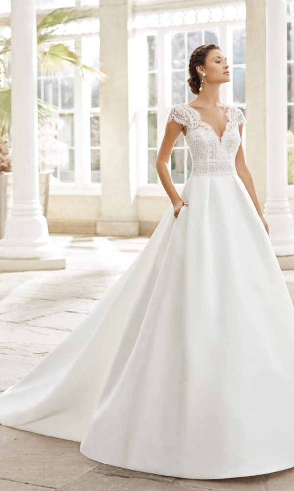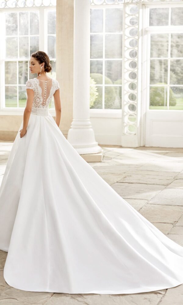 wedding dress 16517 by Naviblue features an Mermaid silhouette. This dress has strapless with high-neck neckline. Lace embellishment and a natural waistline is designed to make you look stunning.