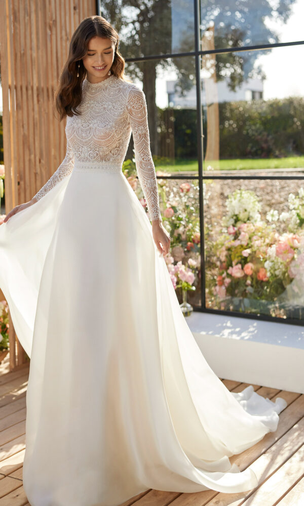 Youthful A-line two-piece wedding dress with removable overskirt in organza silk with beaded lace embellishment at the waist; halter neckline and round opening on the back. Stylish Rosa Clará Couture outfit in beaded lace and crepe fabric.