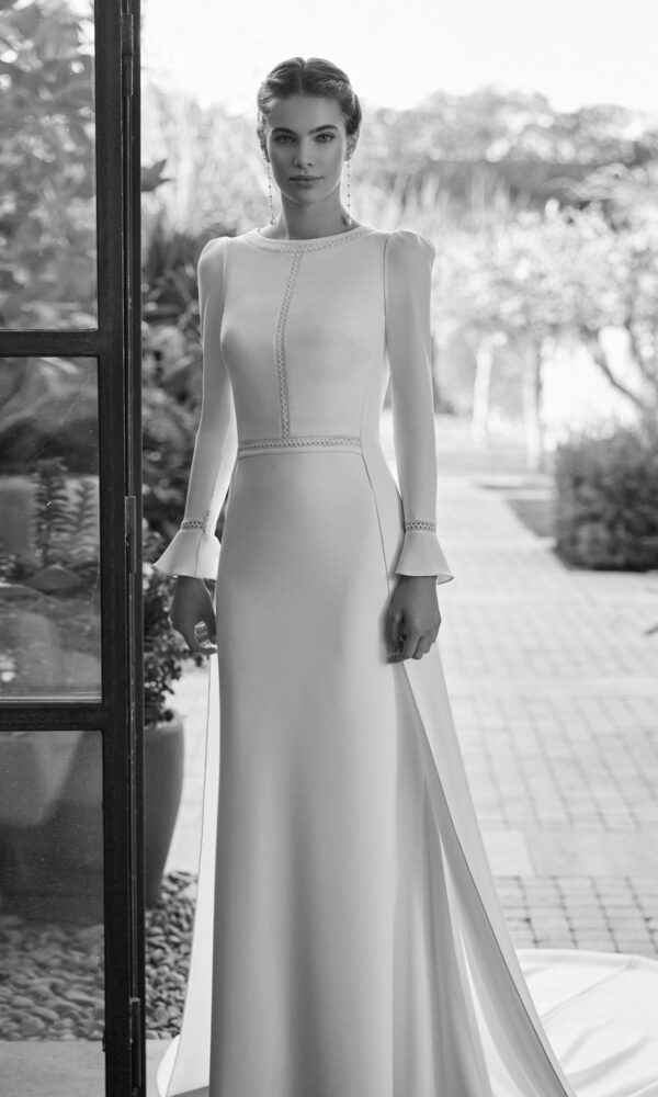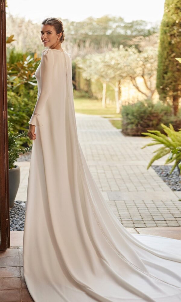 Romantic two-piece sheath-style wedding dress, crafted in muss. This is one of the most delicate Rosa Clara Boheme sets, featuring a plunging neckline, plunging back, skirt with slit, and a cape. Elegant two-piece mermaid wedding dress, made in stretch crepe. A strapless neckline and georgette cape complete the design. A delicate Rosa Clara Boheme design. Simple sheath-style wedding dress, made in stretch crepe. A plunging neckline and V-back complete this Rosa Clara Boheme bridal design.