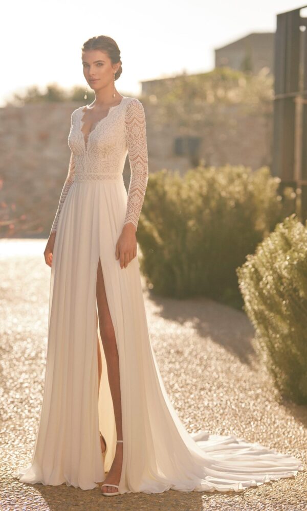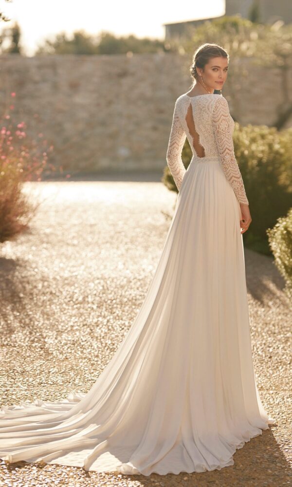 Romantic two-piece sheath-style wedding dress, crafted in georgette embellished with lace and beadwork. Featuring a bateau neckline, V-back, three-quarter sleeves and detachable train. Walk down the aisle with pride in this exclusive Rosa Clara Boheme look.