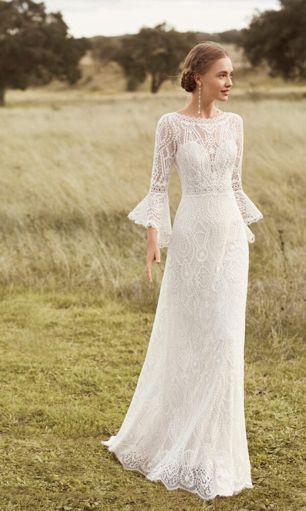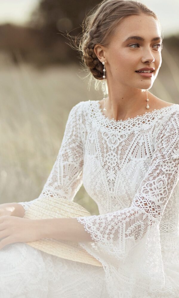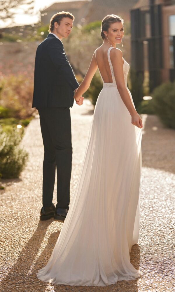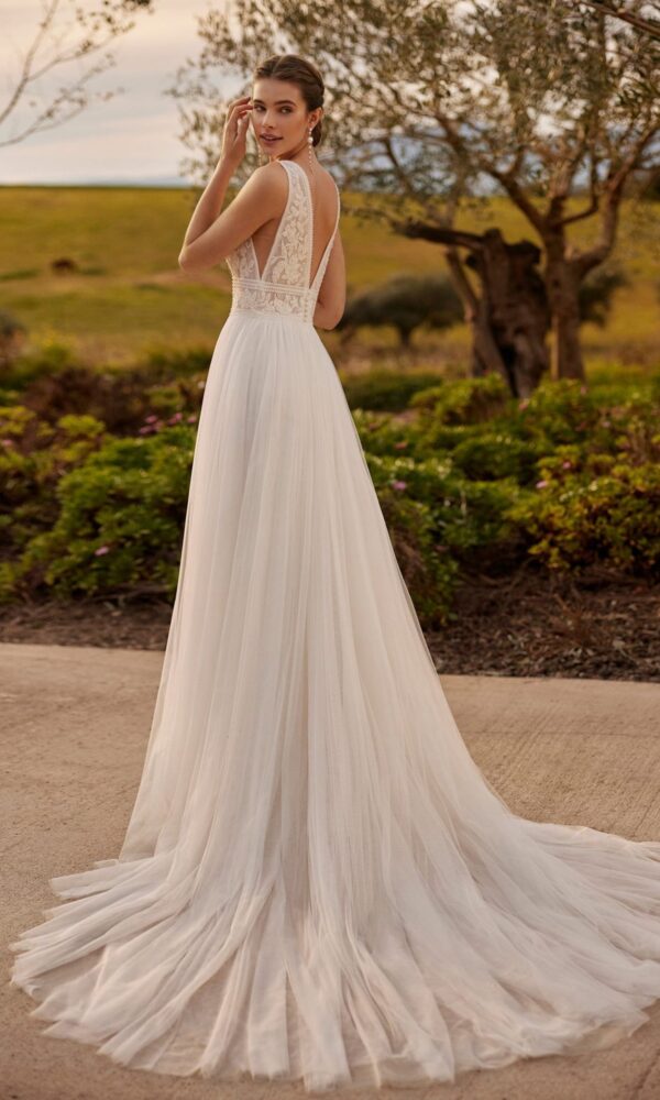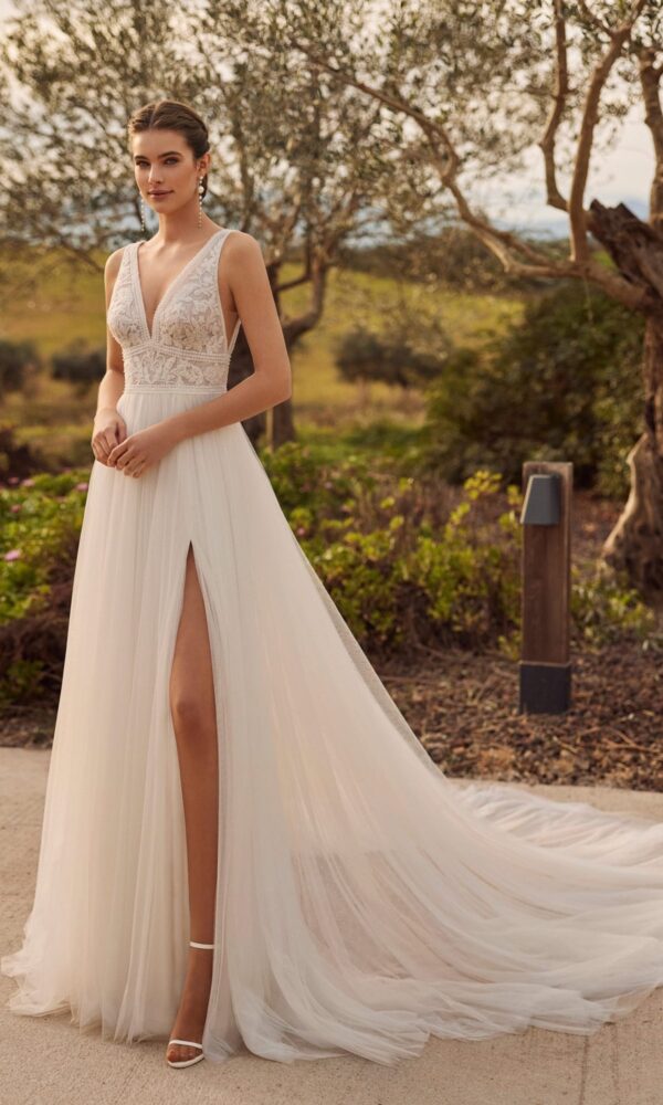 Simple ballgown-style wedding dress, crafted in muss and lace. Featuring a plunging neckline, plunging back, skirt with a front slit and detachable sleeves. Delight in this Rosa Clara Boheme bridal look.