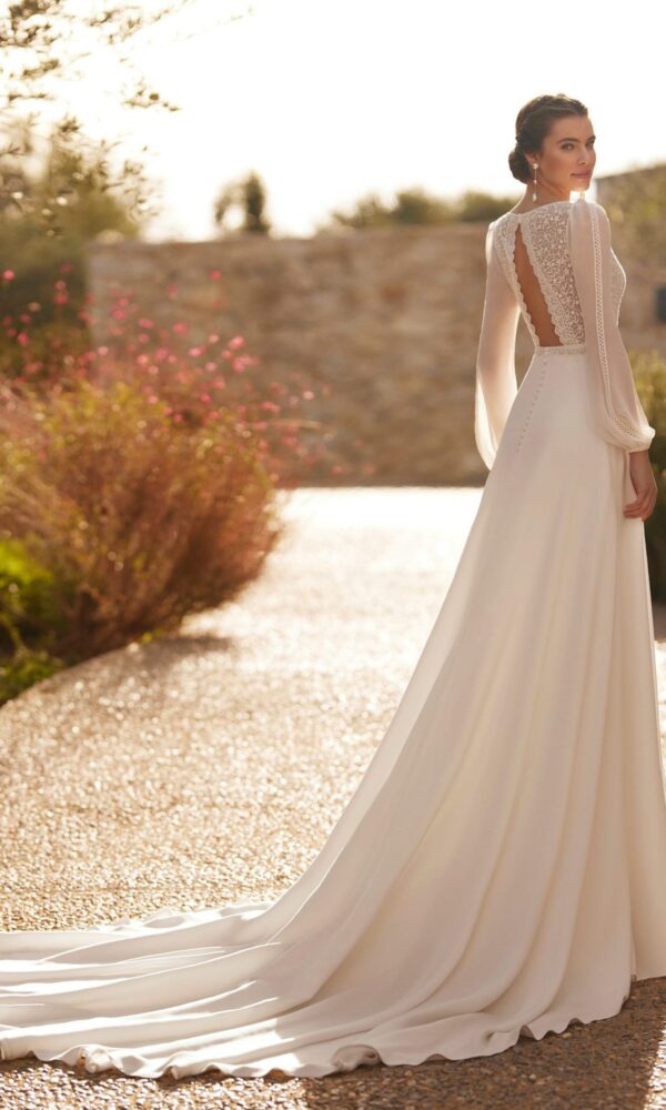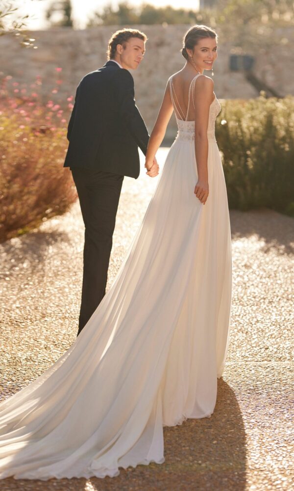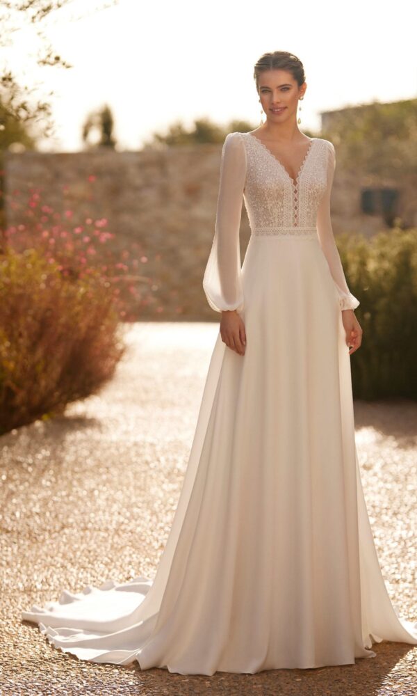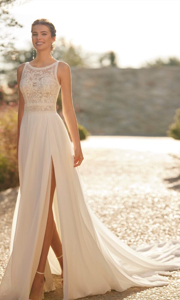 Romantic ballgown-style wedding dress, crafted in soft tulle, lace and beadwork. Featuring a plunging neckline, V-back and skirt with a front slit. Stand out in this Rosa Clara Boheme bridal design.