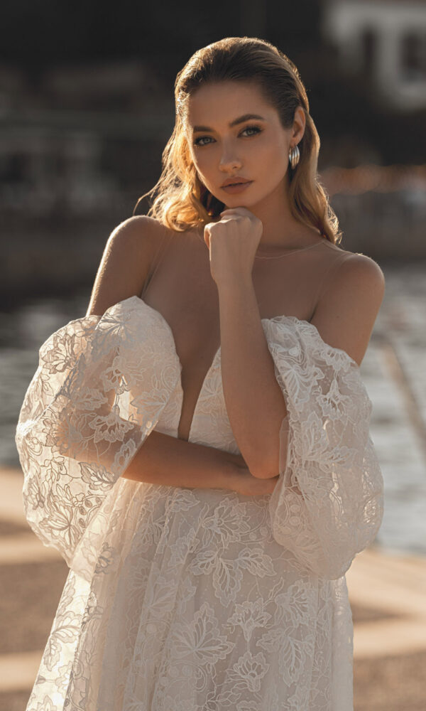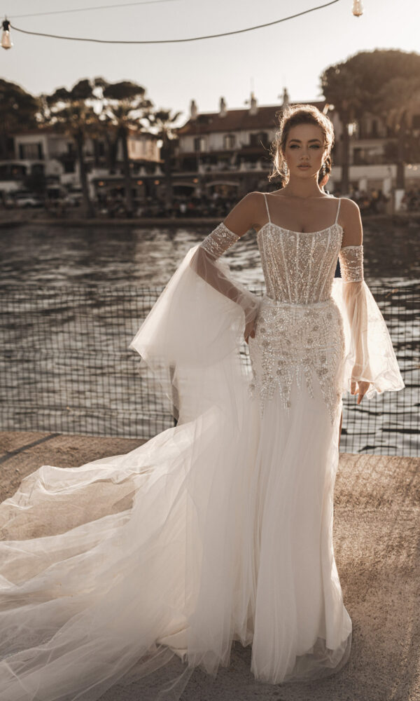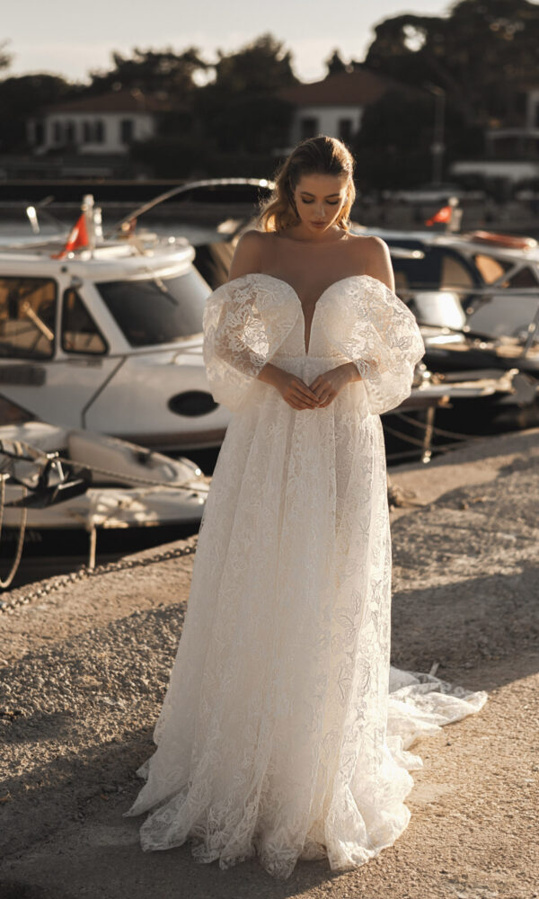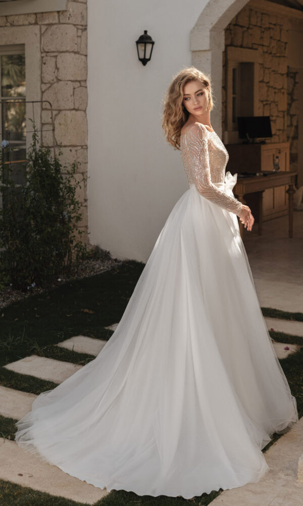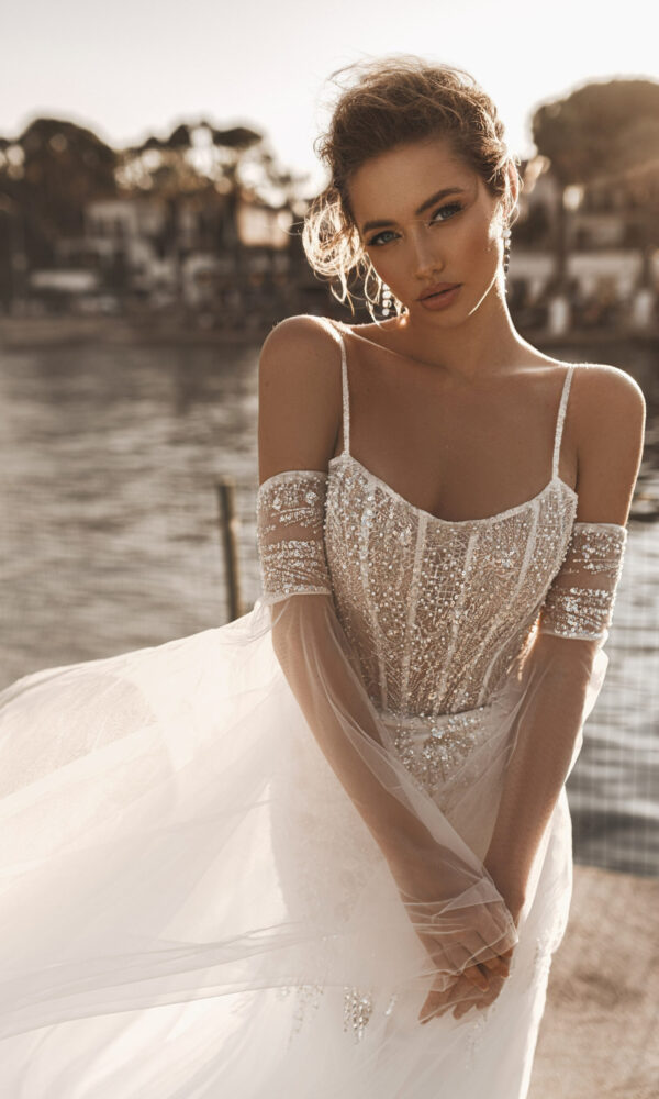Puffy bridal gown Escentric from the Eccentric Love collection by Victoria Soprano features an A-line silhouette. This dress has straps with illusion neckline. Pearl embellishment and a natural waistline is designed to make you look stunning.