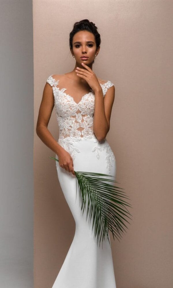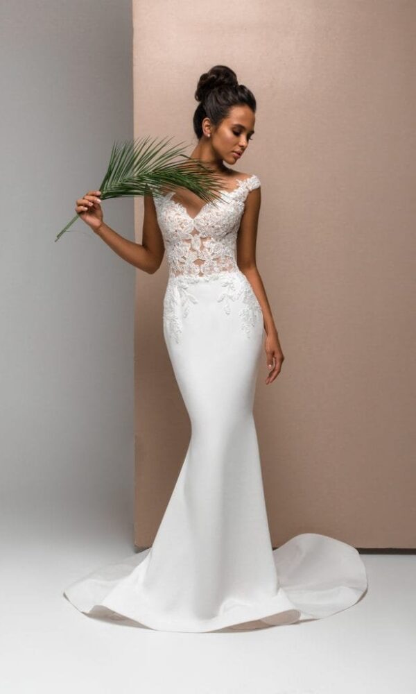 Romantic bride's dress Grace from the Studio collection by Naviblue features an A-line silhouette. This dress has off the shoulder with off-shoulder neckline. Lace embellishment is designed to make you look stunning.