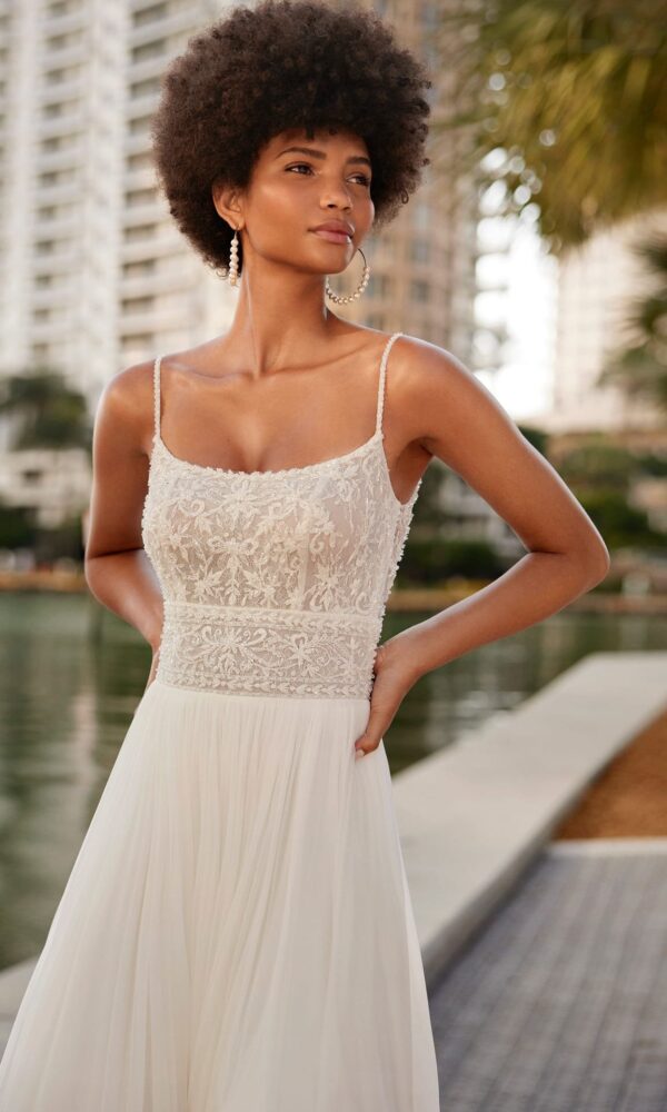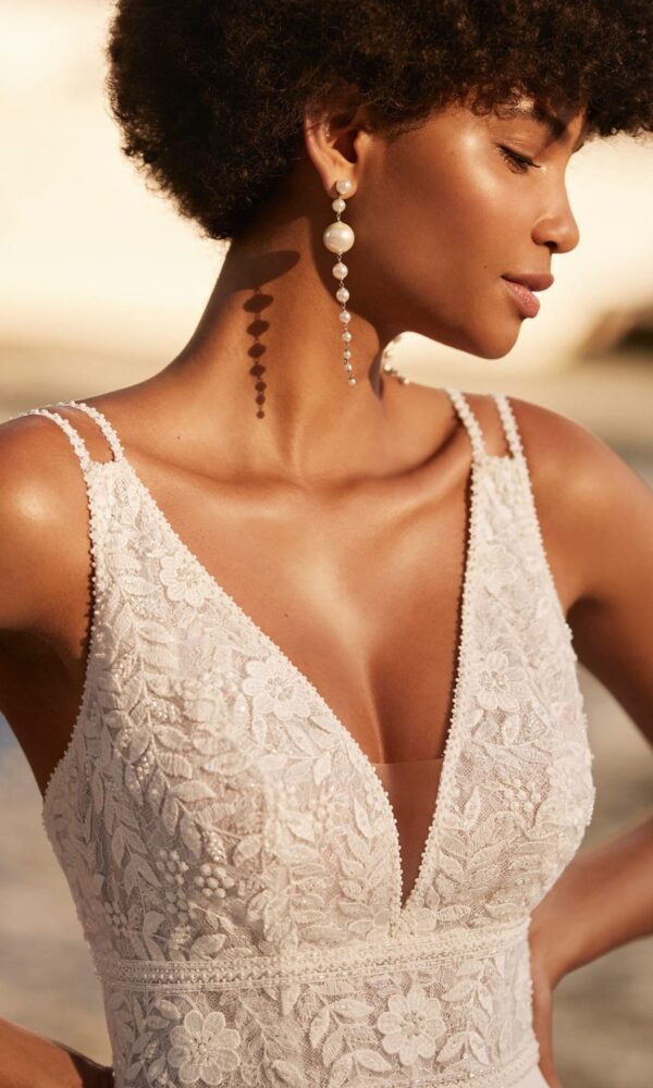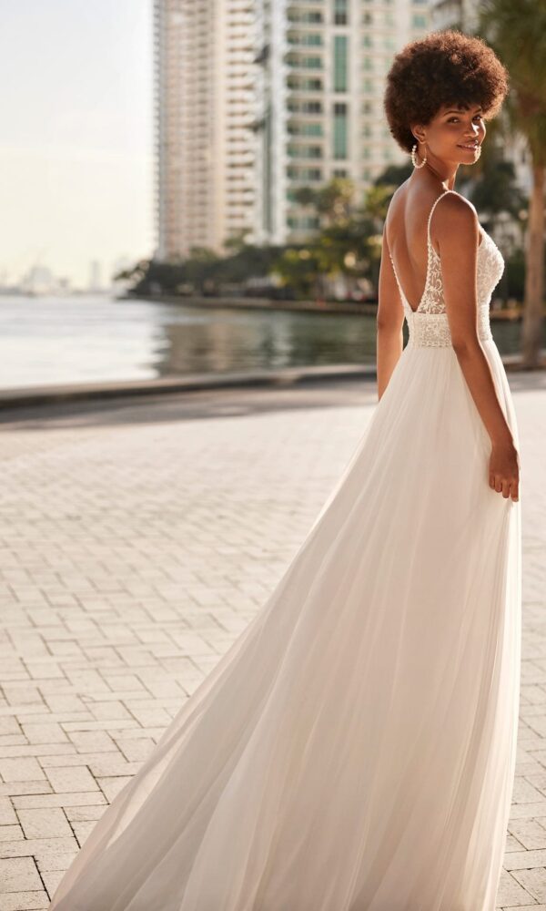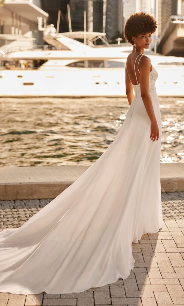 The lightness of our Imperio wedding dress is just what you need to walk confidently in comfort down the aisle. This long wedding dress is the ultimate in romance, and is crafted in a natural colour with an A-line silhouette. The sexy lace bodice clings to the bust, and is topped off by a bold plunging V-neckline and delicate straps. The back is open to the waist, with a small set of buttons to add elegance and practicality to the dress. Just picture yourself walking down the aisle in the fabulous pleated chiffon skirt with an alluring side slit, followed by the long train.