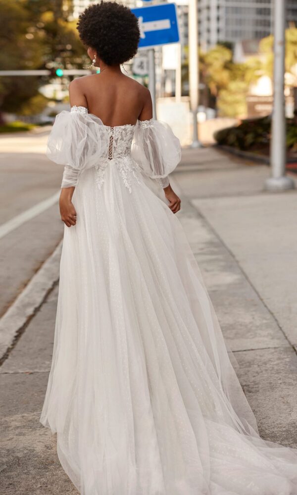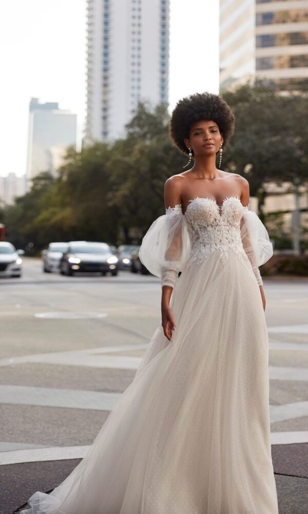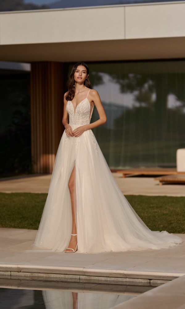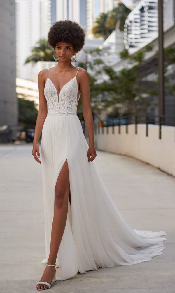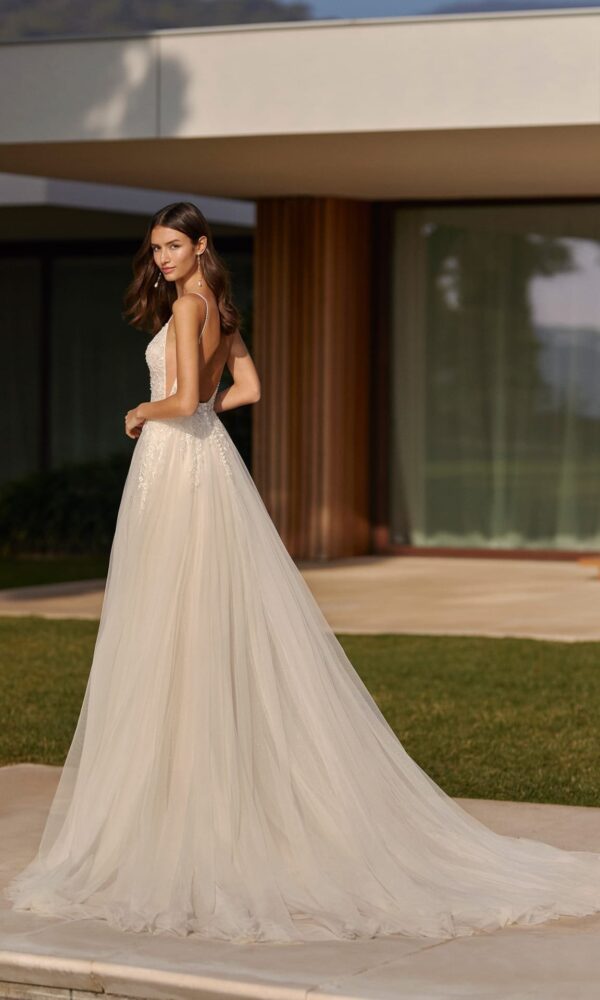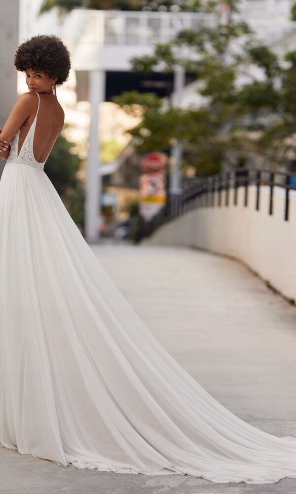 Youthful two-piece sheath-style wedding dress, crafted with fine crepe. Featuring an asymmetric neckline and a cape, all eyes will be in you in this exclusive Rosa Clara Soft set.