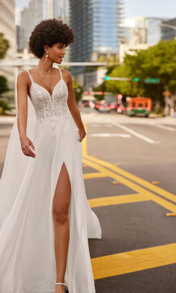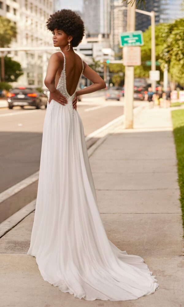Fluid sheath-style wedding dress, crafted in muss combined with a beadwork and lace bodice. The open back and skirt with a front slit complete the design. Stand out in an exclusive Rosa Clara Soft design.