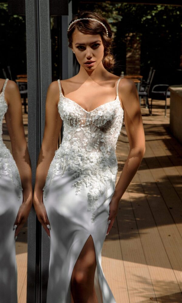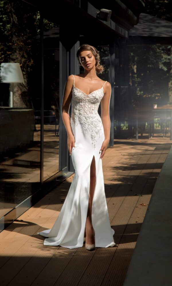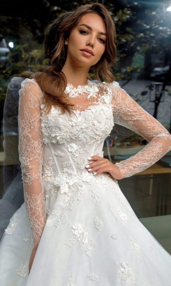 Puffy bridal gown Katrin from the Ambiance collection by Naviblue features an A-line silhouette. This dress has long sleeves with boat neck neckline. Lace embellishment is designed to make you look stunning.