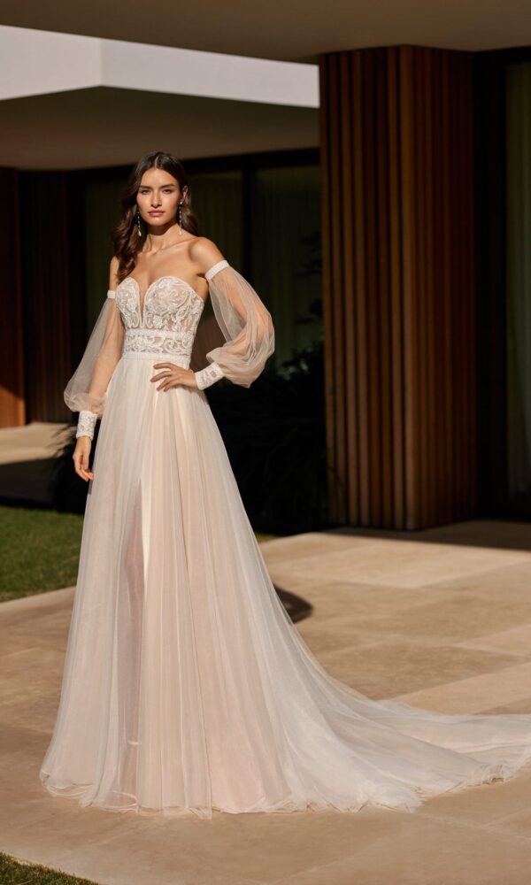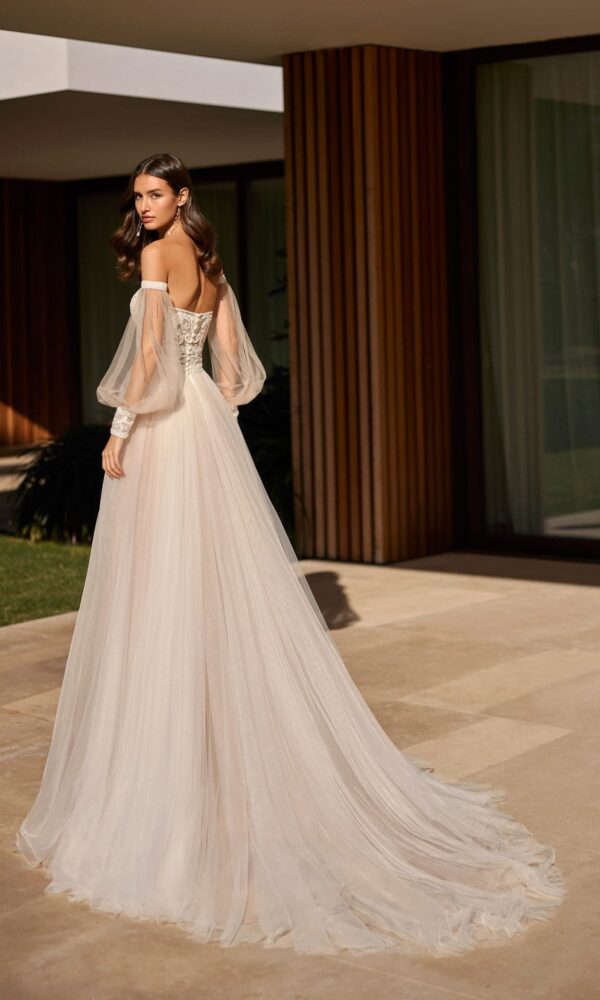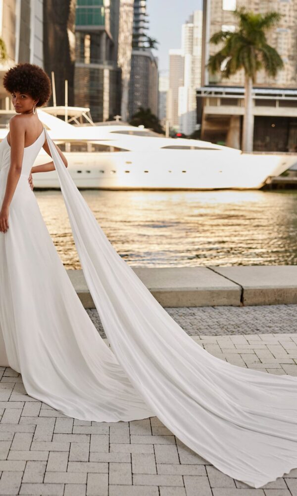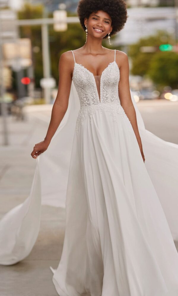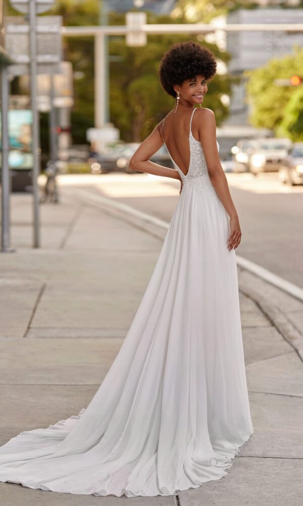 Boho chic sheath-style wedding dress, crafted in georgette, lace and beadwork. Featuring a V-neckline, open back, beadwork straps and skirt with a front slit. Wear this delicate Rosa Clara Soft look on your big day.