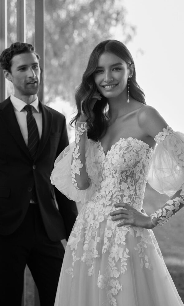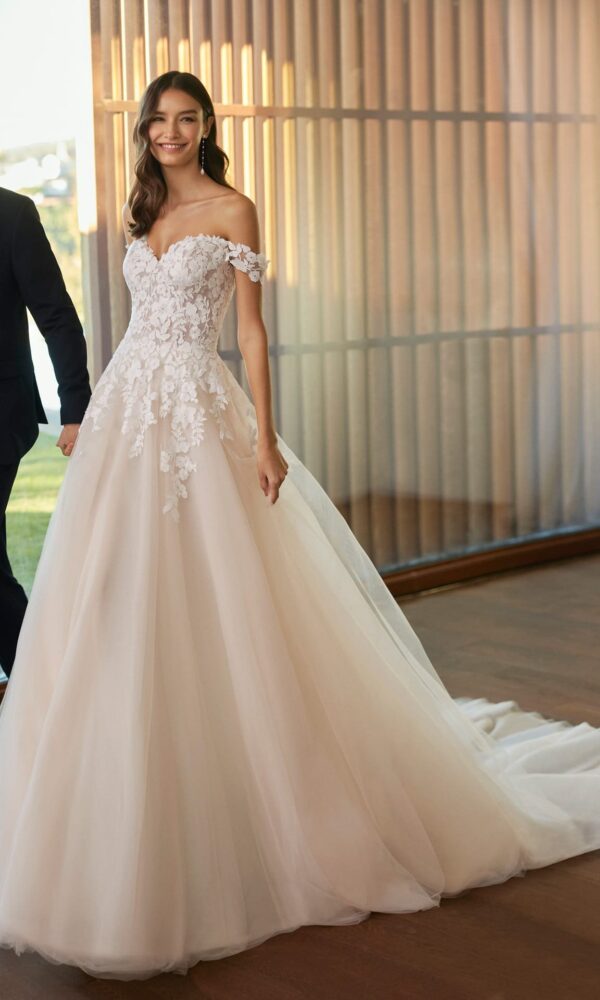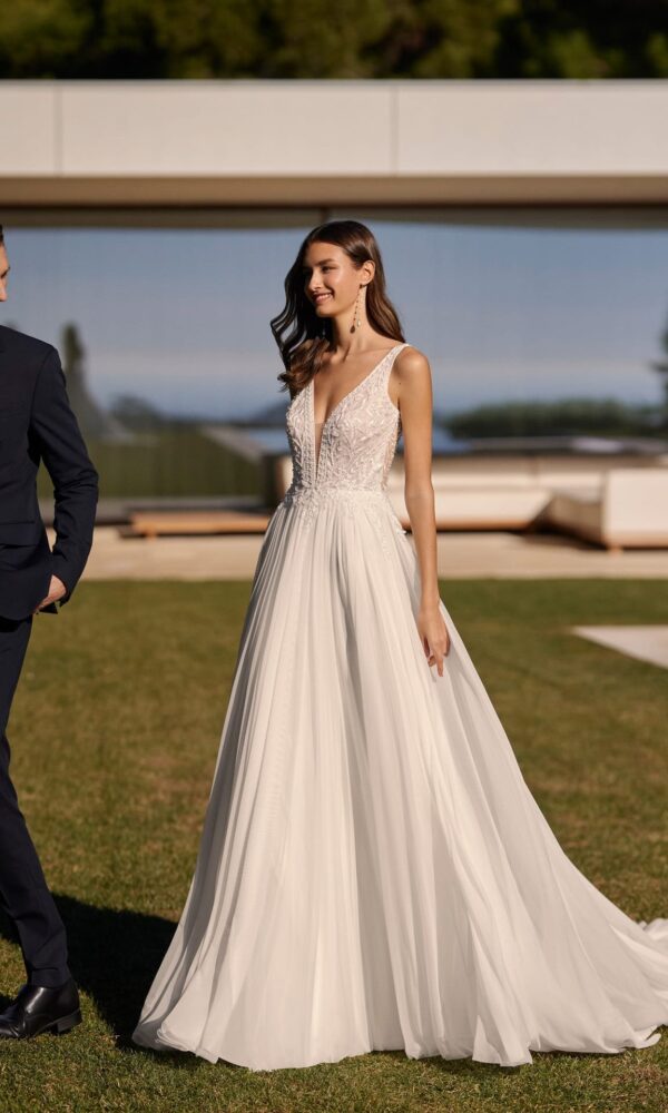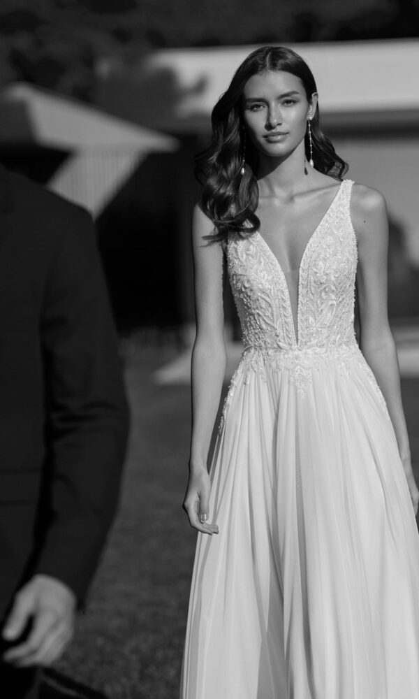Simple sheath-style wedding dress, crafted in muss embellished with beadwork. The square neckline, open back, beadwork straps and skirt with a front slit complete the design. An on-trend Rosa Clara Soft design.