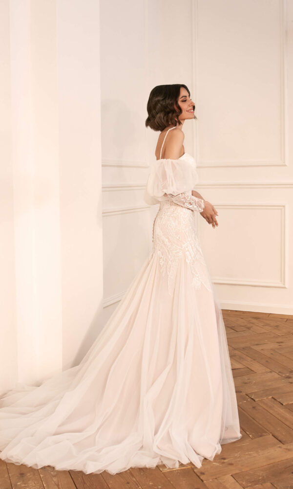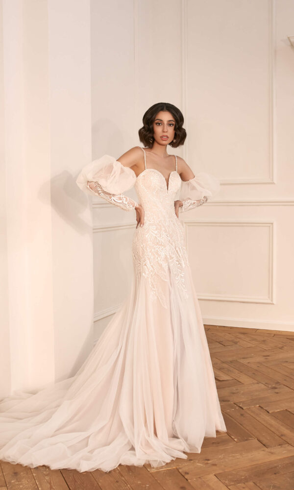 Classic matrimonial attire Kora from the Divine collection by Naviblue features an Mermaid silhouette. This dress has long sleeves with illusion neckline. Embroidery embellishment and a natural waistline is designed to make you look stunning.