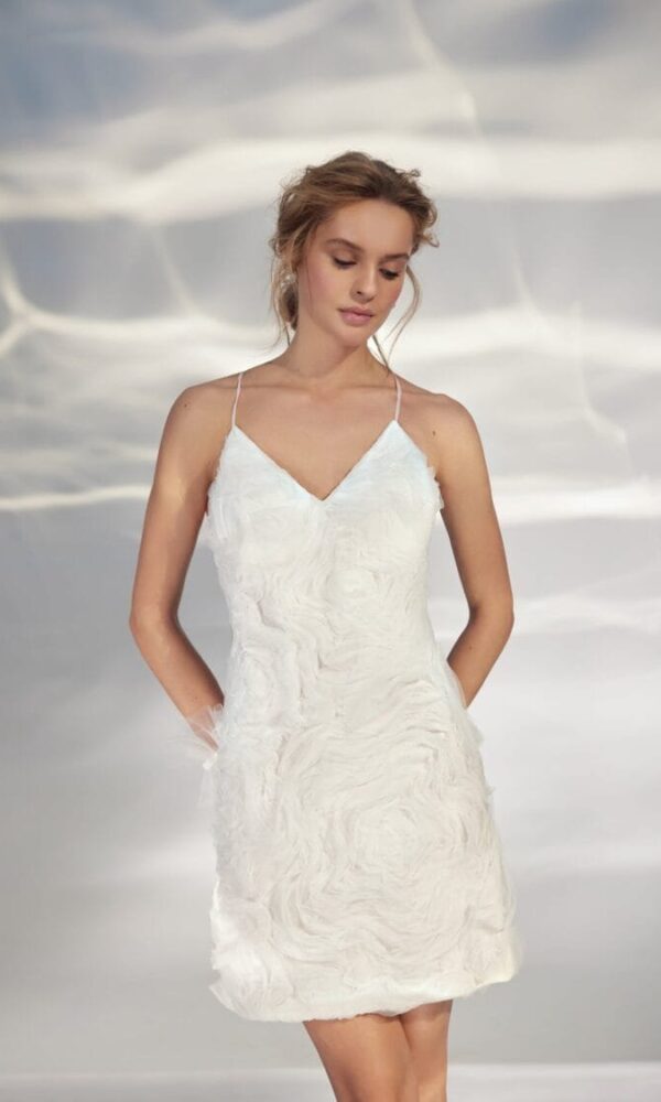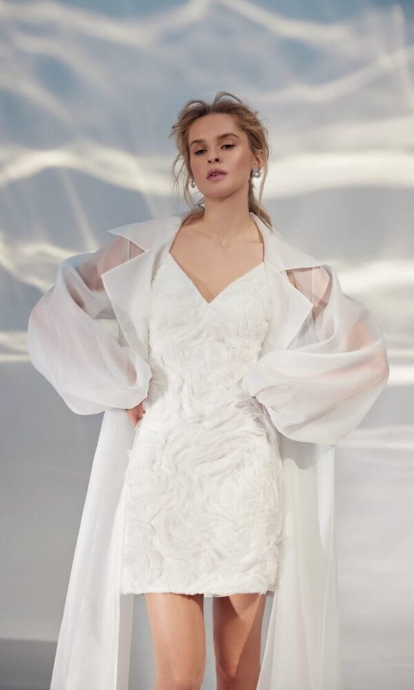 Beach bridal dress L332 from the Starlet collection by Ariamo features an Short silhouette. This dress has long sleeves with boat neck neckline and a natural waistline is designed to make you look stunning.