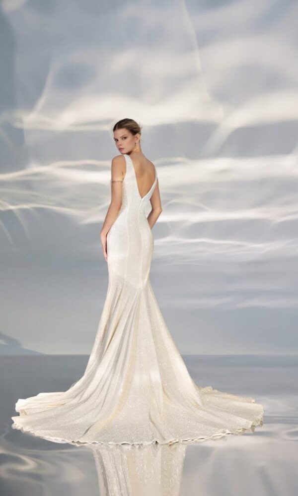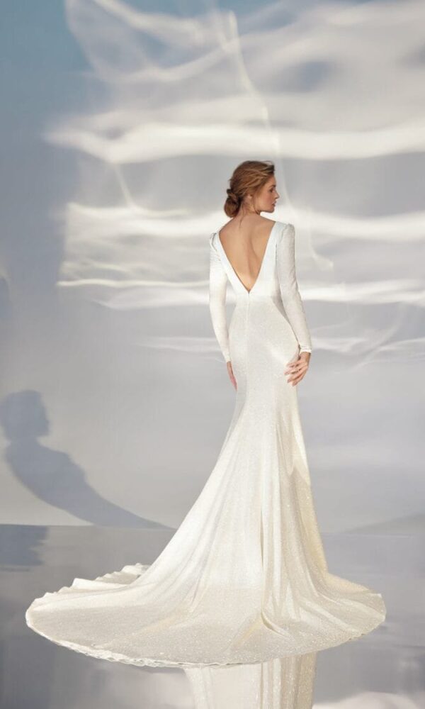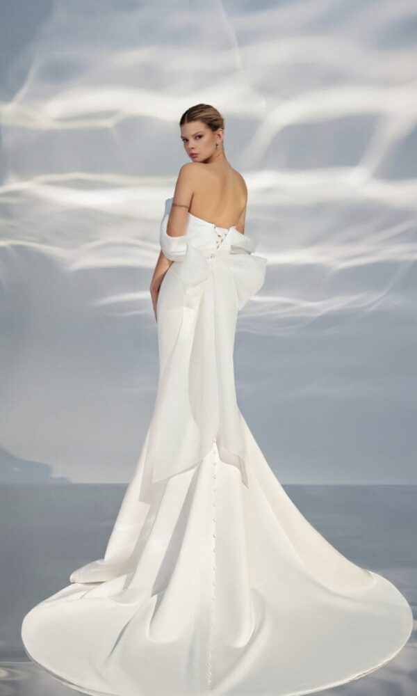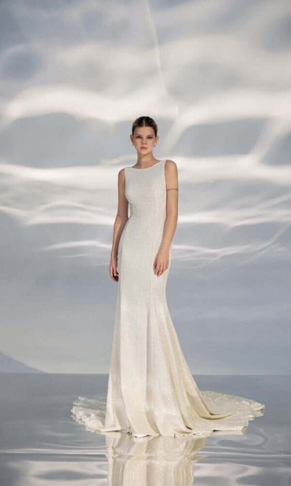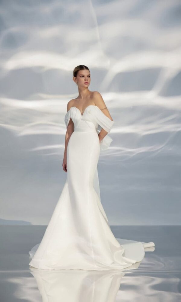 Beach marriage gown L333 from the Starlet collection by Ariamo features an Sheath silhouette. This dress has off the shoulder with square neckline and a natural waistline is designed to make you look stunning.