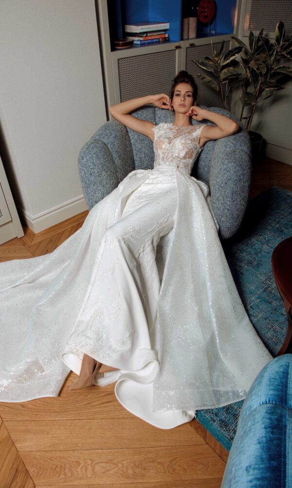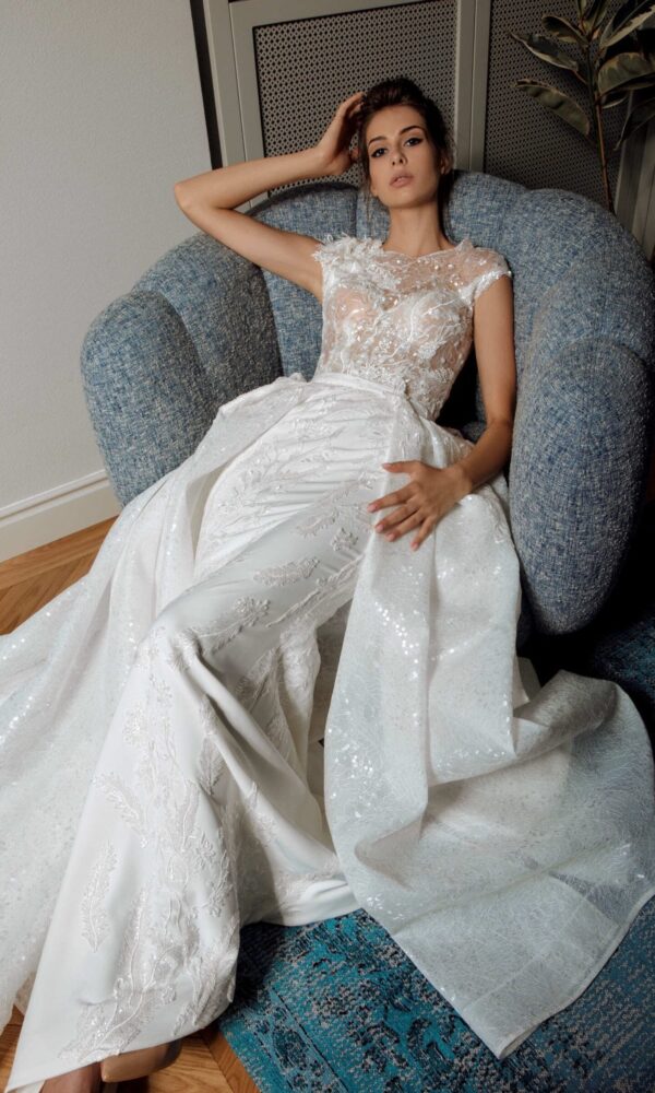 Romantic wedding dress Luca from the Di Rose Bianche collection by Naviblue features an A-line silhouette. This dress has long sleeves with sweetheart neckline. Beaded lace embellishment is designed to make you look stunning.