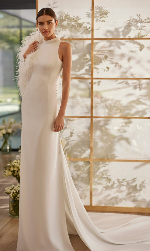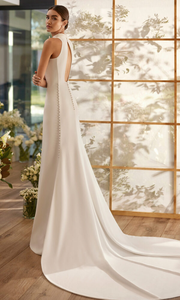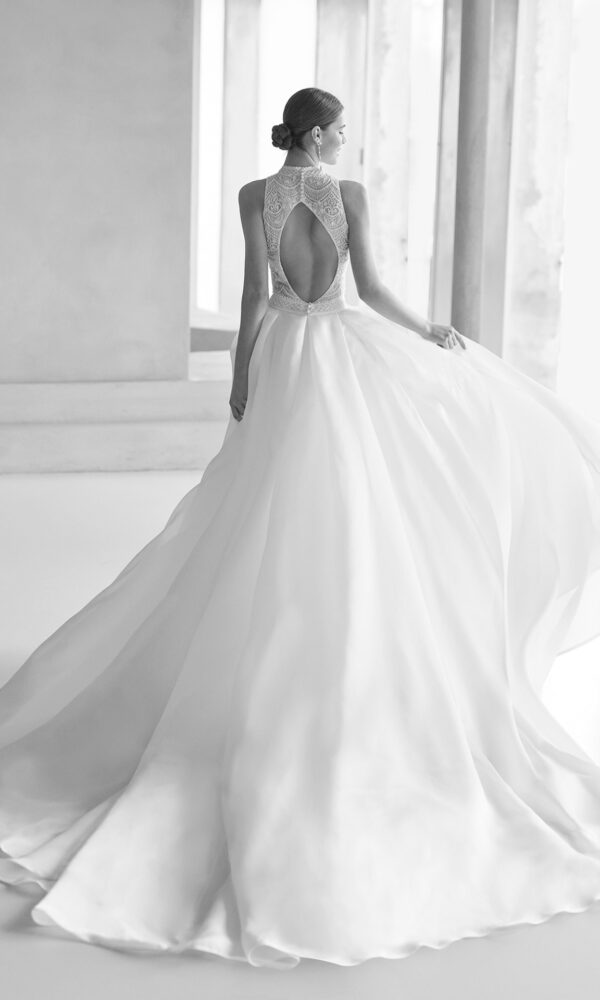 Elegant two-piece wedding dress with an A-line silhouette, made in lace, beadwork and amalfi. A round neckline, buttoned back, long sleeves and detachable amalfi overskirt complete this dreamy Rosa Clará Couture set.