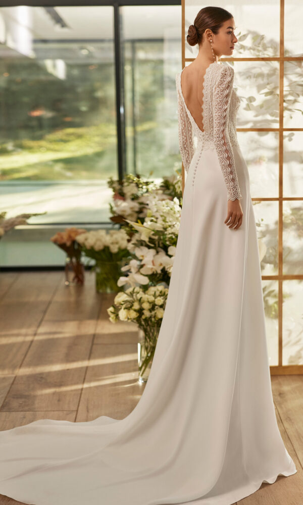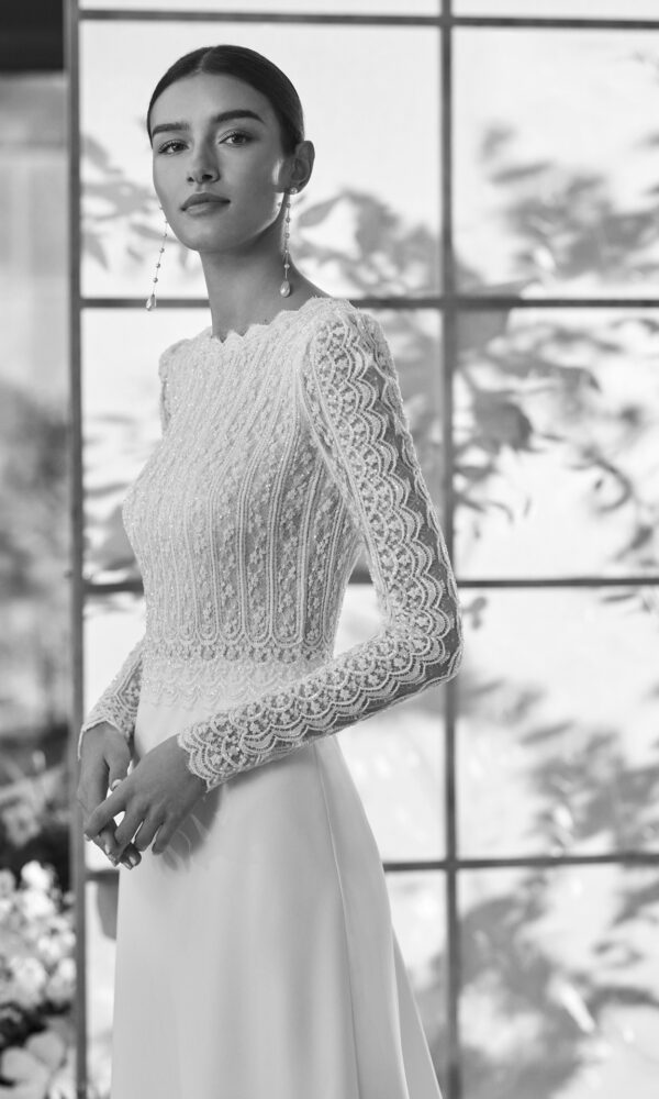 Elegant princess wedding dress made in lace, beadwork and royal tulle. This dreamy Rosa Clará Couture gown features a round neckline, open back and long sleeves.