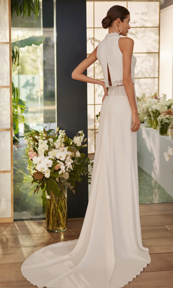 Youthful two-piece sheath-style wedding dress. Made in beadwork lace and silk muslin. Sleeveless, with high neck and buttoned back. Shorter bodice.Dreamy Rosa Clará Couture set.