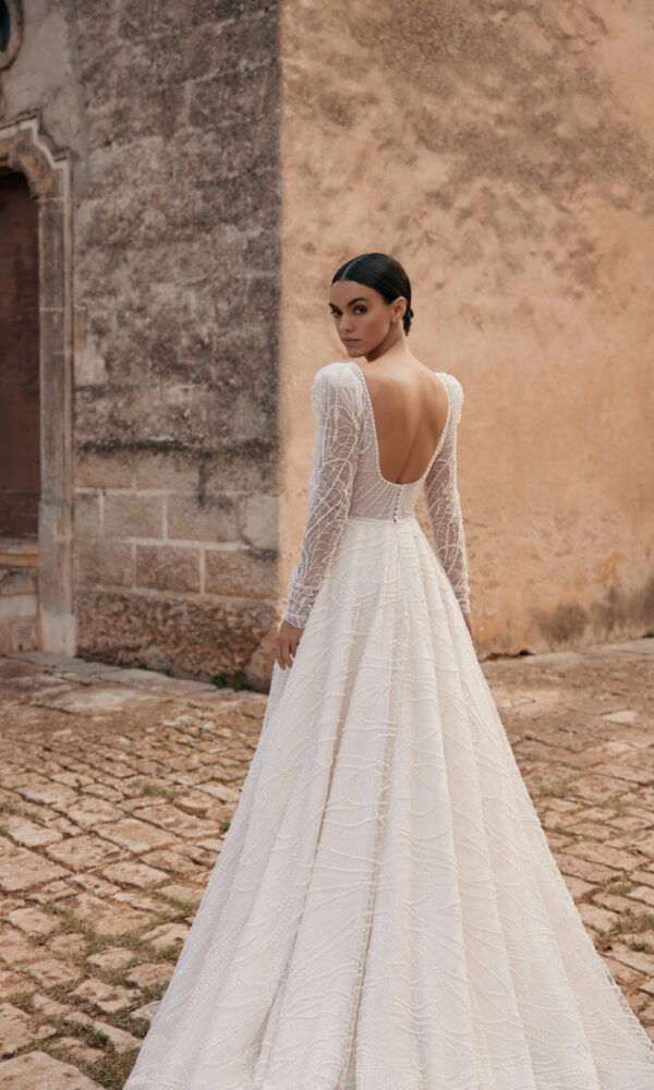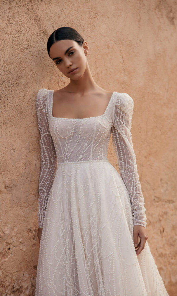 Romantic nuptial dress Nicola from the L`amore Per Sempre collection by Madioni features an A-line silhouette. This dress has long sleeves with off-shoulder neckline. Glitter embellishment and a natural waistline is designed to make you look stunning.