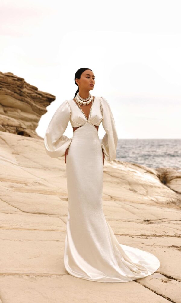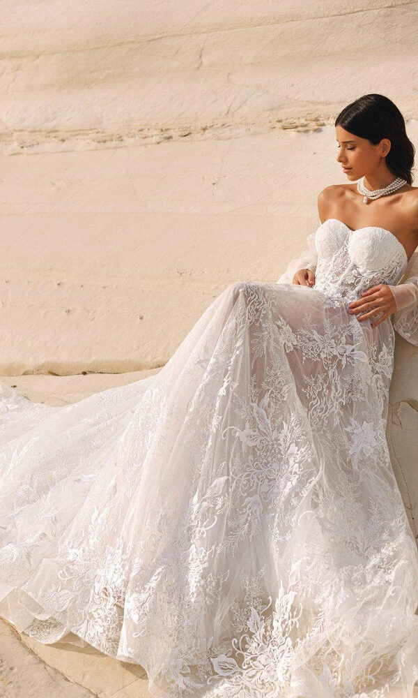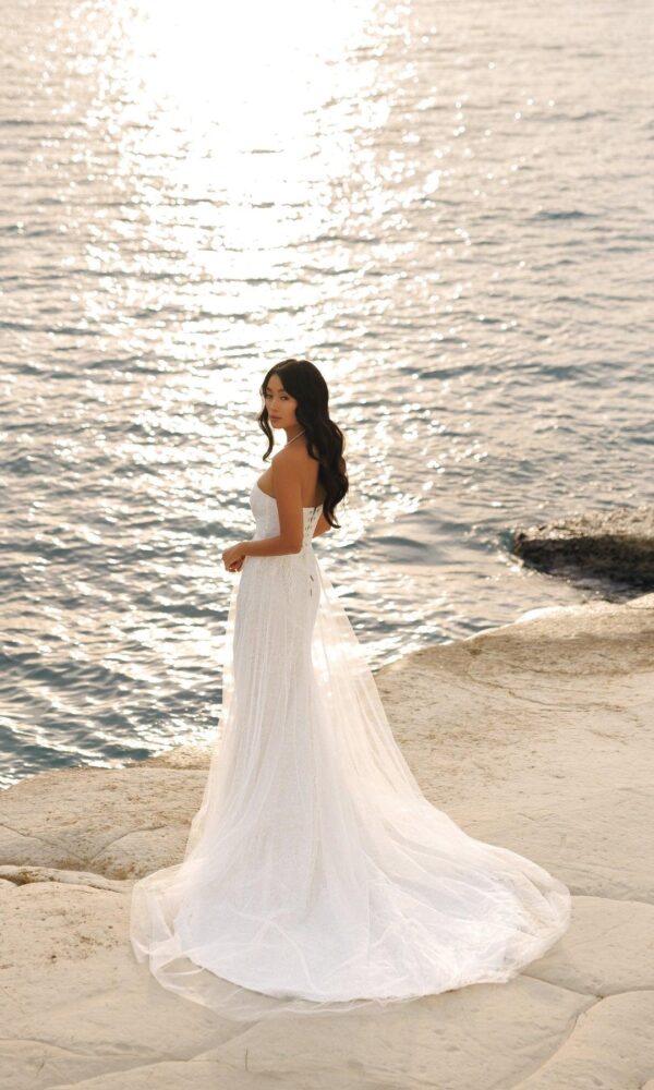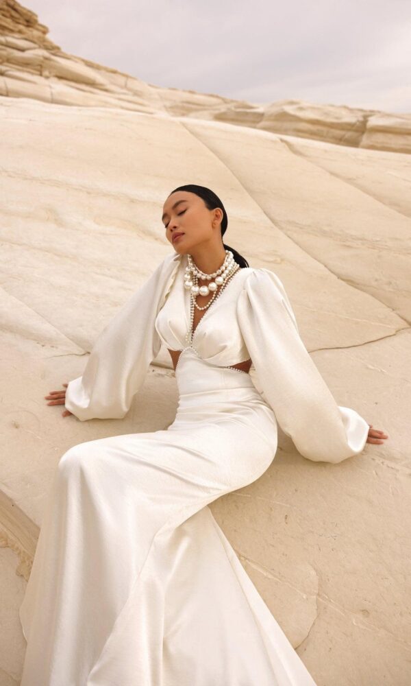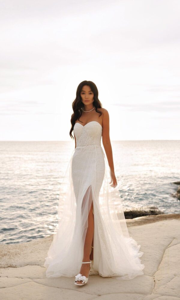 bridal dress Nova from the White Stones New collection by Victoria Soprano features an Mermaid silhouette. This dress has open shoulders with sweetheart neckline. Pearl embellishment and a natural waistline is designed to make you look stunning.