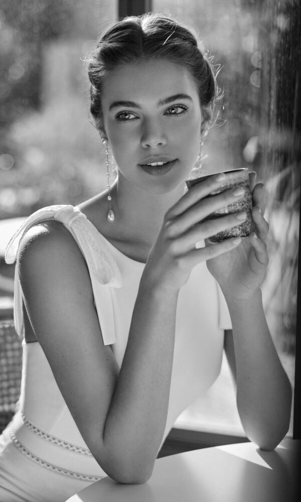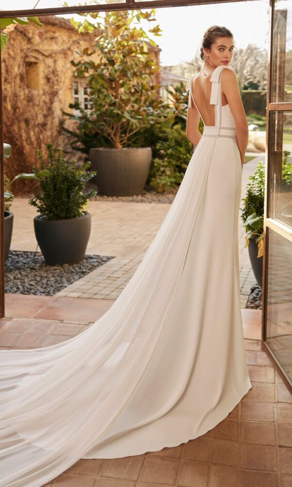 If you want to impress your guests, just choose Ulaya. The stunning A-line cut of this chiffon dress will give you unrivalled movement and a wonderfully fresh feel. Prepare to fall in love. The strapless neckline keeps your shoulders on show, and is complemented by a romantic bodice in elaborate floral lace. An open back and elegant detachable sleeves, edged in lace to match the sash of the skirt, lend even further appeal. The long skirt with a side slit culminates in a beautiful long train. Simply perfect for a spring civil wedding.