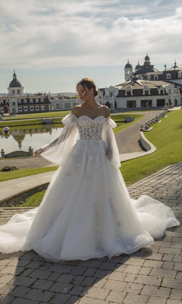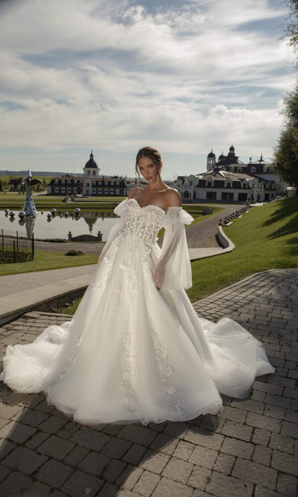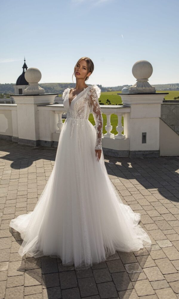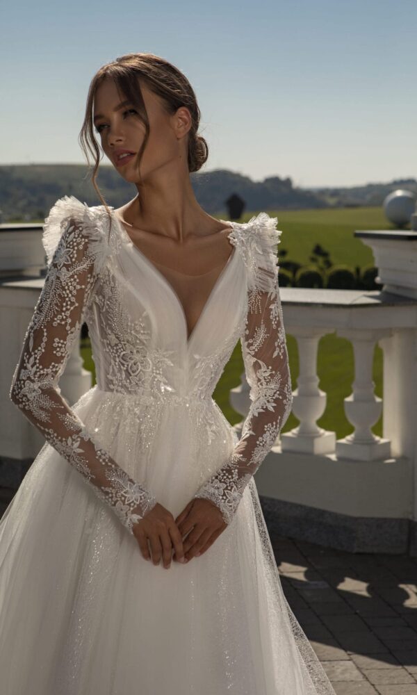 Romantic bride's dress Verona from the L Amour collection by Naviblue features an A-line silhouette. This dress has straps with sweetheart neckline. Lace embellishment is designed to make you look stunning.