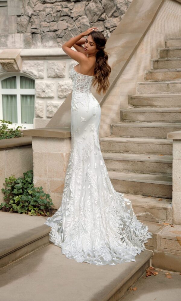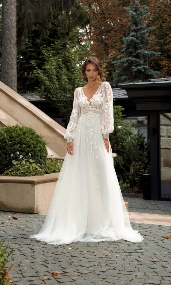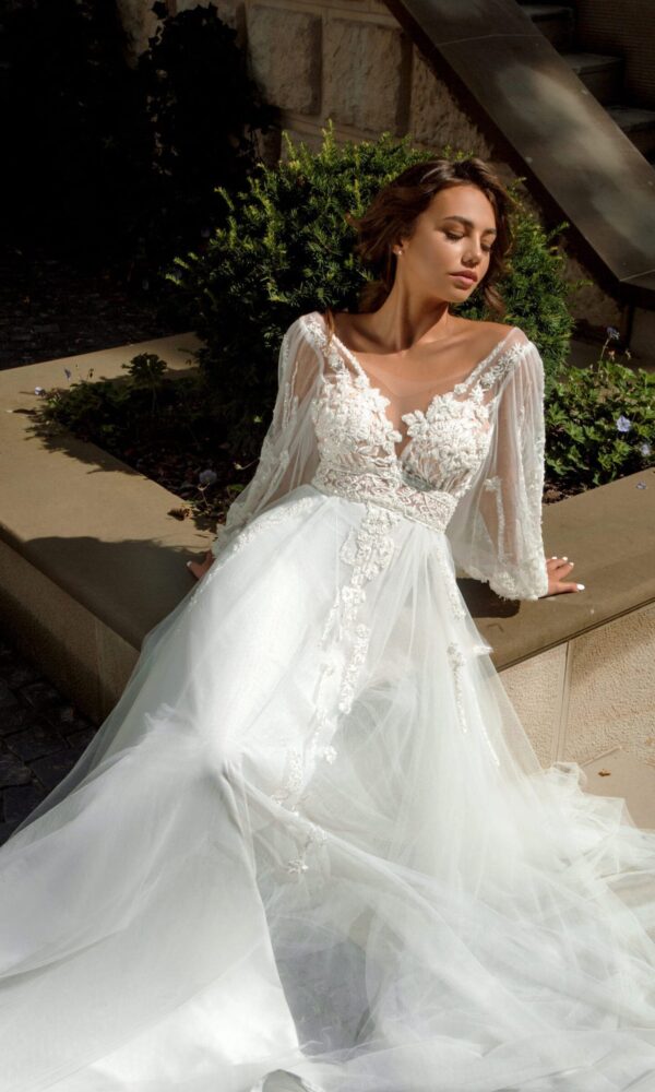 Modern bridal dress Victoria from the Ambiance collection by Naviblue features an Mermaid silhouette. This dress has long sleeves with boat neck neckline. Lace embellishment is designed to make you look stunning.