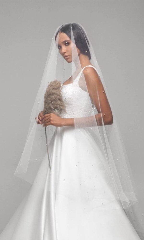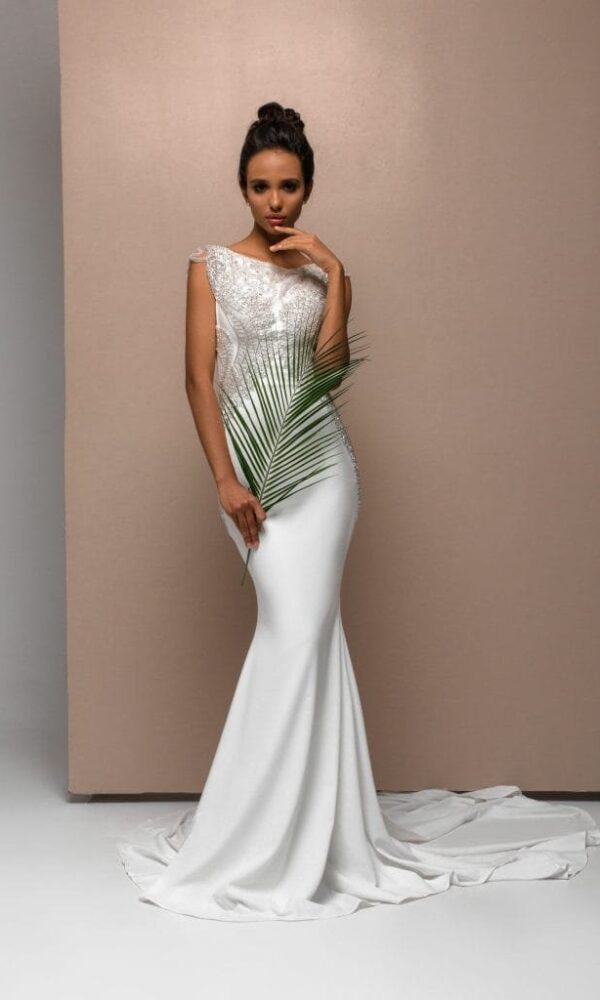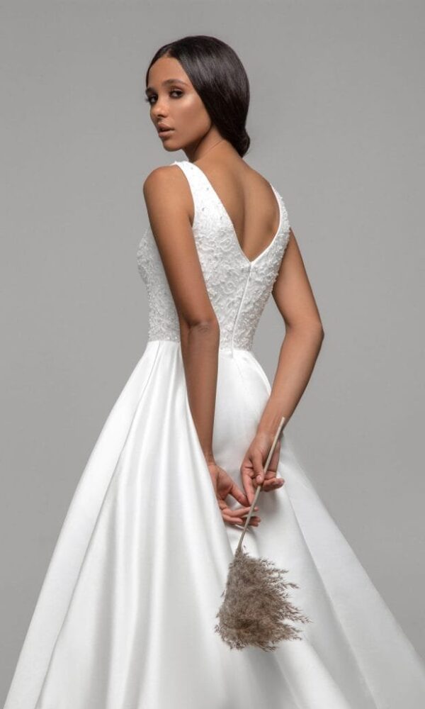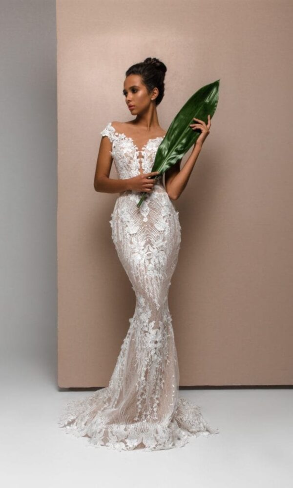 Romantic wedding dress Vivien from the Studio collection by Naviblue features an Mermaid silhouette. This dress has straps with v-neck neckline. Lace embellishment is designed to make you look stunning.