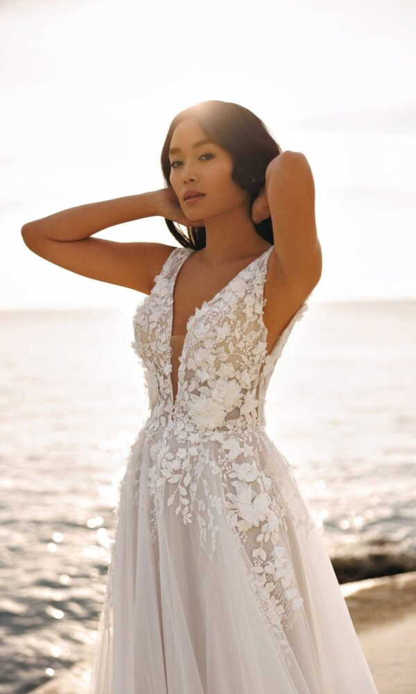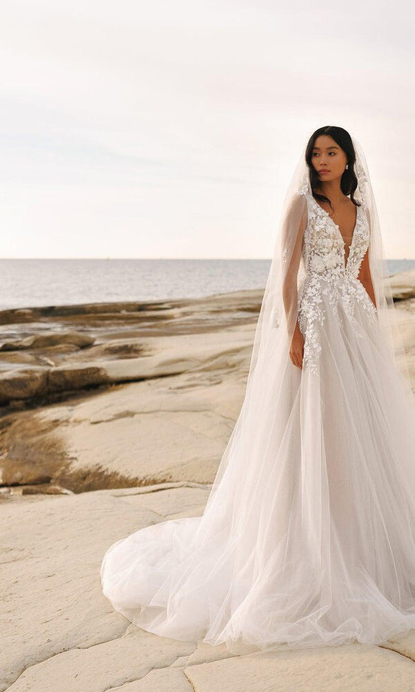 matrimonial attire Zinnia from the White Stones New collection by Victoria Soprano features an A-line silhouette. This dress has removable sleeves with sweetheart neckline. Cape embellishment and a natural waistline is designed to make you look stunning.