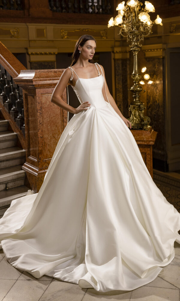 No fashionable collection is complete without ball gown wedding dresses, with prices varying based on the fabric used. Satin and silk are commonly used for their noble qualities and ability to hold shape, while chiffon is often used to create flowing skirts. For those wanting to purchase a ball gown wedding dress, options made from tulle or organza are ideal. Luxurious materials like lace highlight elegance and sophistication. The combination of dense and airy fabrics, along with the alternation of open and closed parts, brings the most beautiful variations of bridal looks to life. Luxurious fabric and well-thought-out decorative elements highlight the body’s beautiful curves and conceal minor imperfections. Ball gown wedding dresses epitomize: